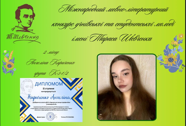 у обласному етапі ХIІІ Міжнародного мовно-літературного конкурсу учнівської та студентської молоді імені Тараса Шевченка серед здобувачів освіти ЗП(ПТ)О у Харківській області