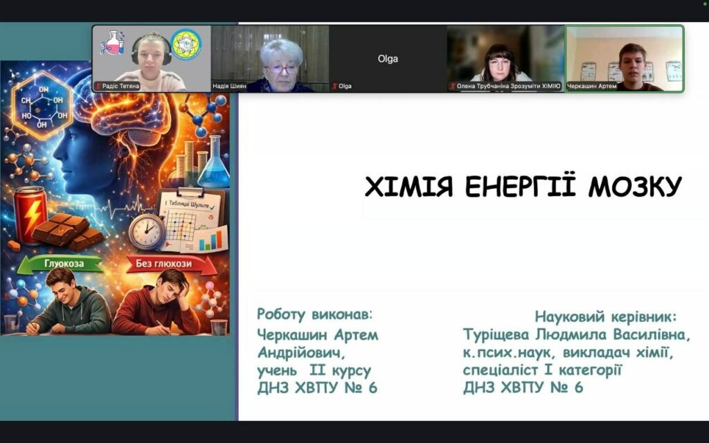 Наш представник виступив із проєктом на тему: «ХІМІЯ ЕНЕРГІЇ МОЗКУ». Дослідження викликало жвавий інтерес та дискусії серед учасників, адже воно поєднує теоретичну базу хімії з практичним застосуванням, актуальним для нашого регіону.