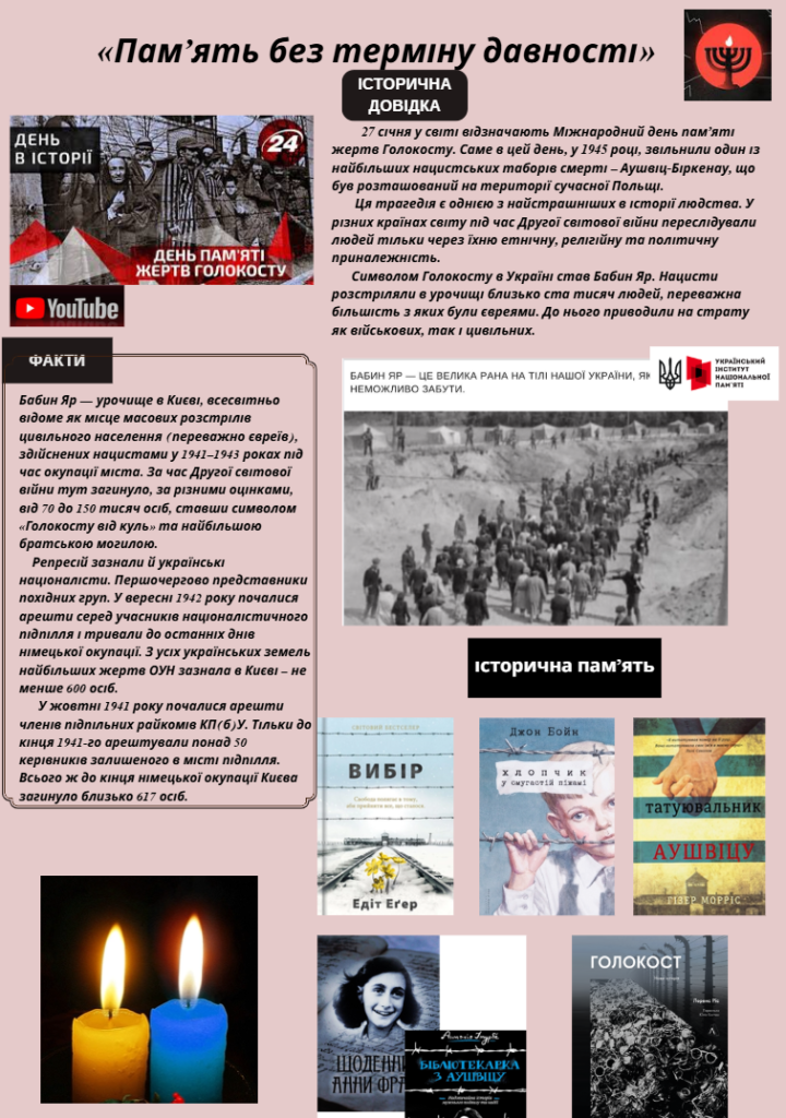 Щороку, 27 січня, у річницю звільнення військами Першого Українського фронту в’язнів нацистського табору в Освенцімі, світове співтовариство вшановує пам’ять жертв Голокосту. Це одна з найбільших в історії людства трагедій, яка змушує замислитись над цінністю життя, свободи та миру.