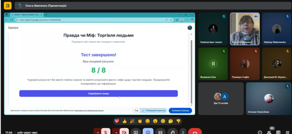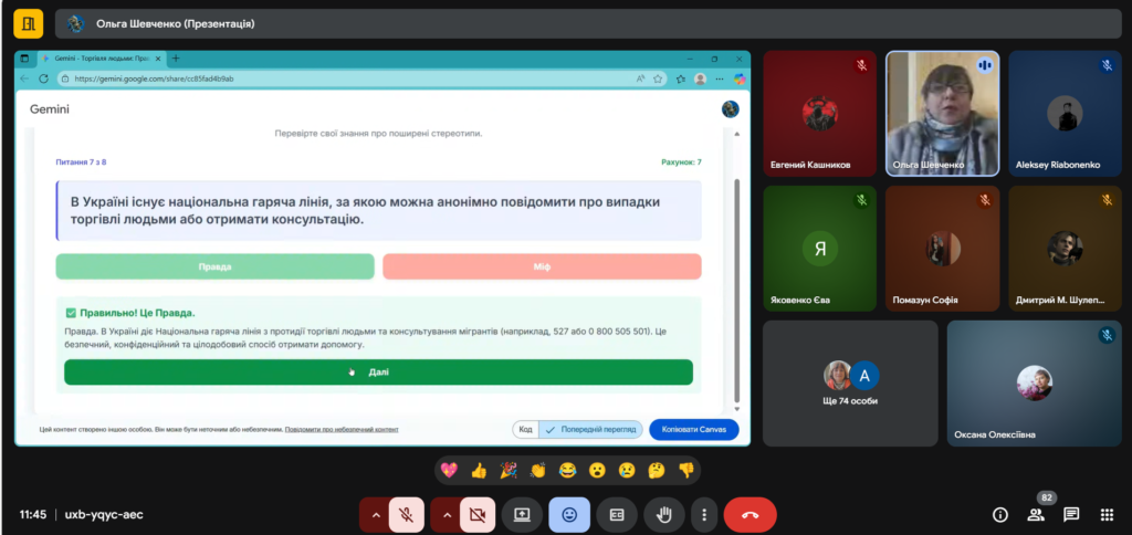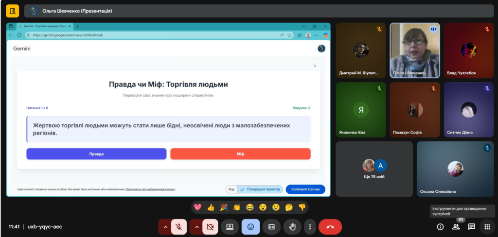 Захід пройшов у форматі діалогу, що дозволило учням активно обговорювати можливі ризикові ситуації та відпрацьовувати навички прийняття безпечних рішень. Були продемонстровані інформаційні матеріали, що ілюструють реальні історії та механізми захисту.
