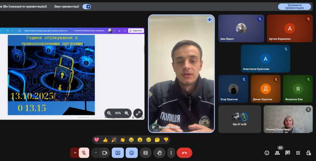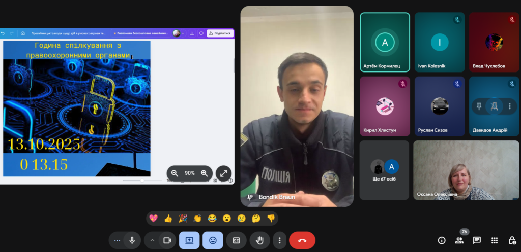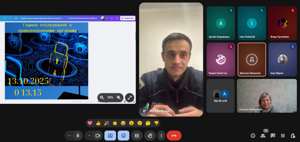 Найбільш жвавою частиною зустрічі стала сесія запитань-відповідей, під час якої учасники мали змогу поставити правоохоронцю запитання щодо конкретних ситуацій, з якими вони стикалися в Інтернеті. Старший лейтенант надав практичні поради та чіткі інструкції, як діяти у випадку виявлення кіберзлочину.