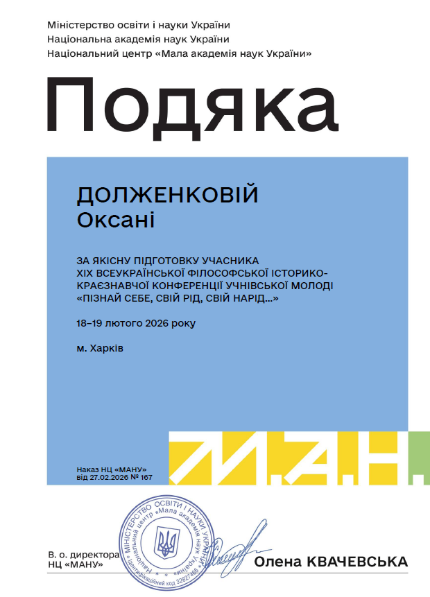 Адміністрація училища висловлює щиру вдячність викладачам-наставникам, які допомагали Катерині у підготовці наукової роботи: заступника директора з навчально-виховної роботи Оксані ДОЛЖЕНКОВІЙ та викладачці історії Ларисі ШАРОВІЙ. Ваша підтримка — це запорука успіху наших студентів!