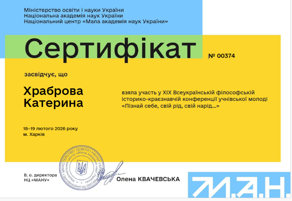 Студентка 2 курсу Катерина Храброва взяла участь у ХІХ-й Всеукраїнській філософській історико-краєзнавчій конференції «Пізнай себе, свій рід, свій нарід».